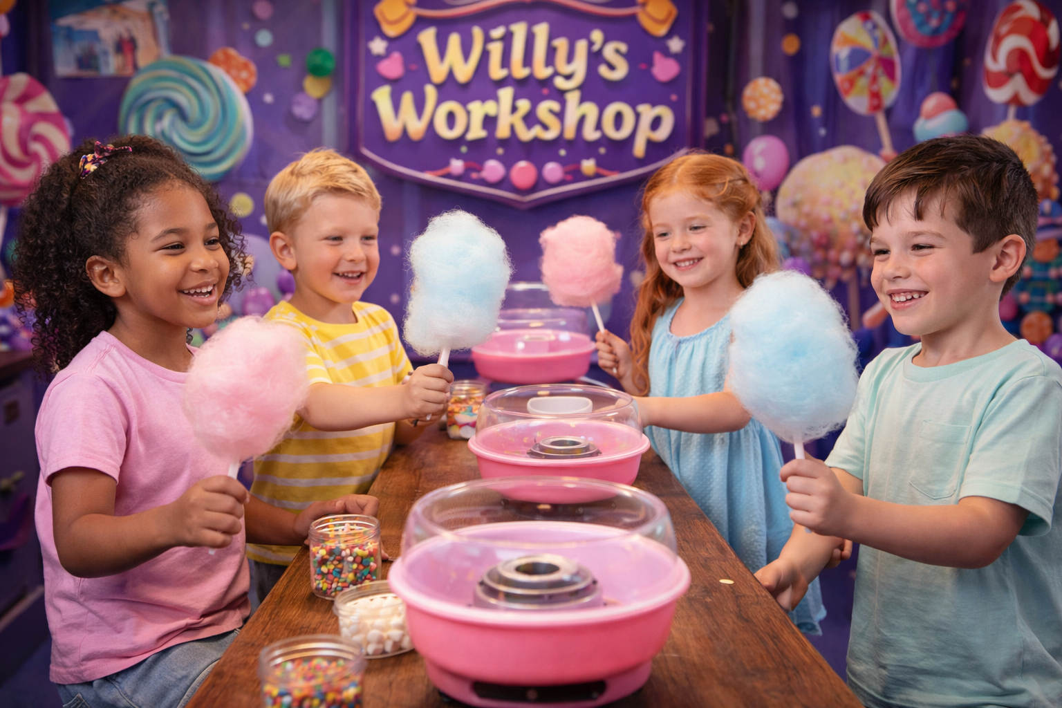 Willy’s Workshop also doubles as a private party space, making it the perfect setting for unforgettable birthday celebrations and special events. With guided candy-making activities, sweet decorations, and plenty of Bubble Joy magic, every party becomes a one-of-a-kind experience.